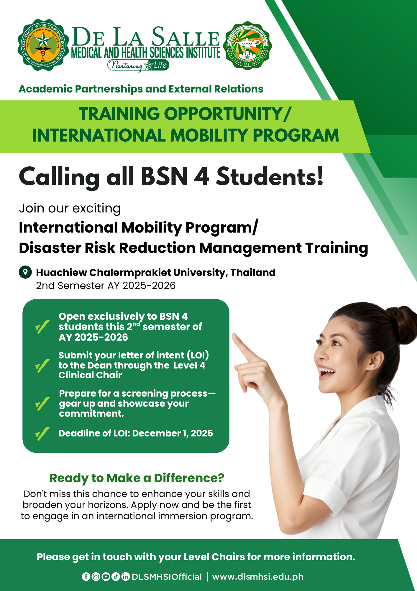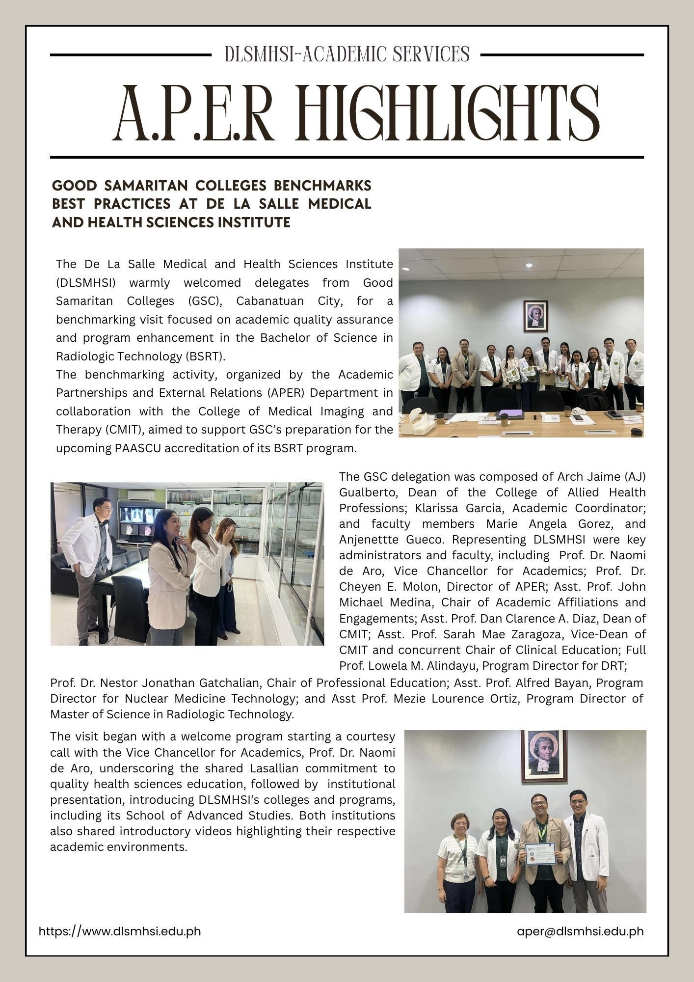 The Office of Academic Partnerships and External Relations (APER) is the strategic hub for fostering institutional linkages and international collaborations at De La Salle Medical and Health Sciences Institute. APER plays a key role in advancing the institution’s internationalization agenda by building academic networks, facilitating student and faculty mobility, and cultivating meaningful partnerships that contribute to global education and engagement.
